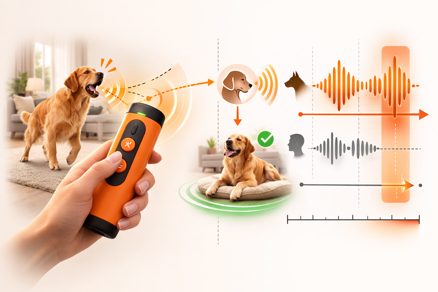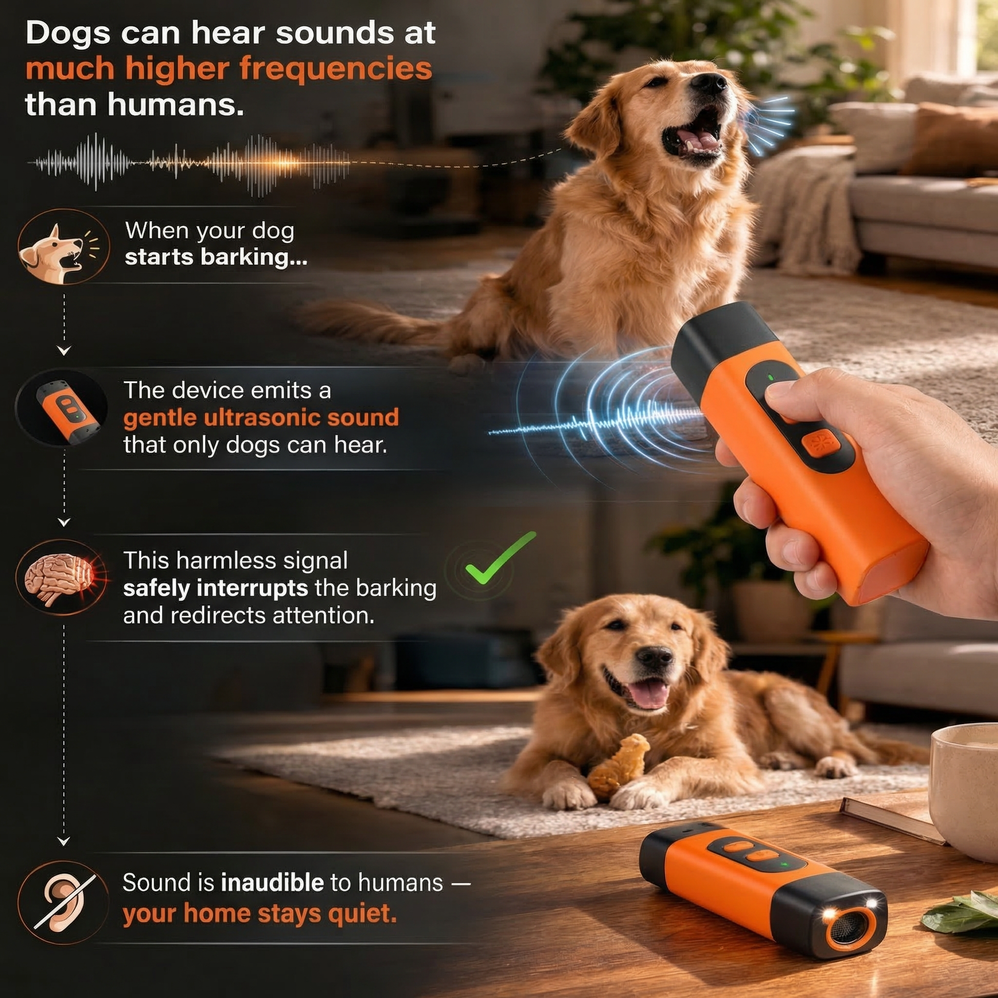 When your dog starts barking, the device emits a gentle ultrasonic sound only dogs can hear. This harmless signal safely interrupts the barking and helps your dog quickly learn to stay calm — no shocks, no pain, just simple behavior correction.